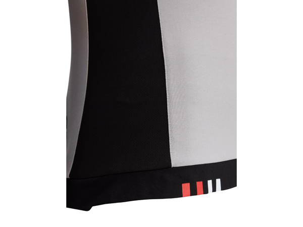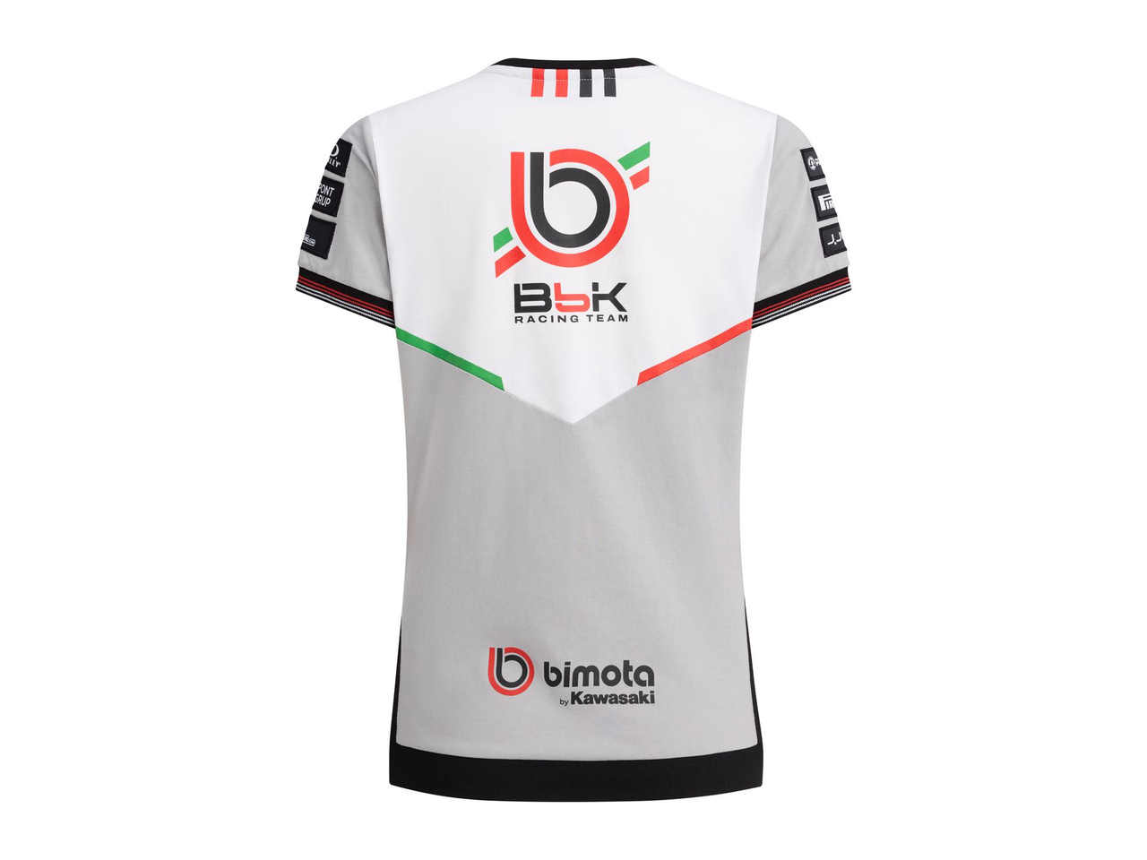 A short-sleeved crew neck t-shirt of which the sleeve edge is cuffed with a red and white banded rib and the hem features the red and white Bimota markings.