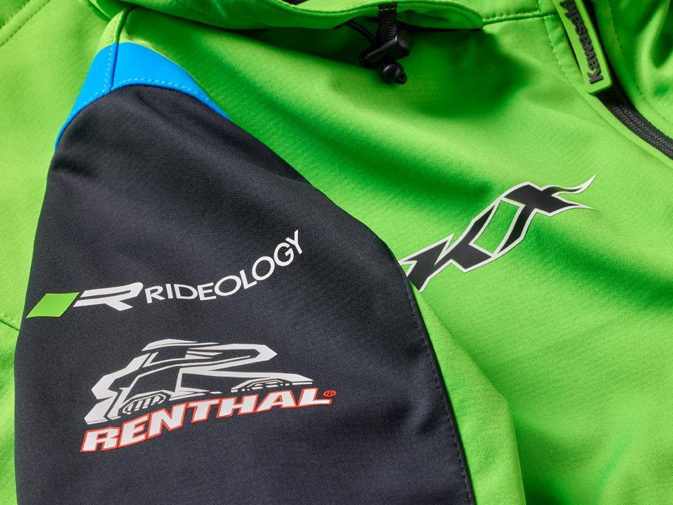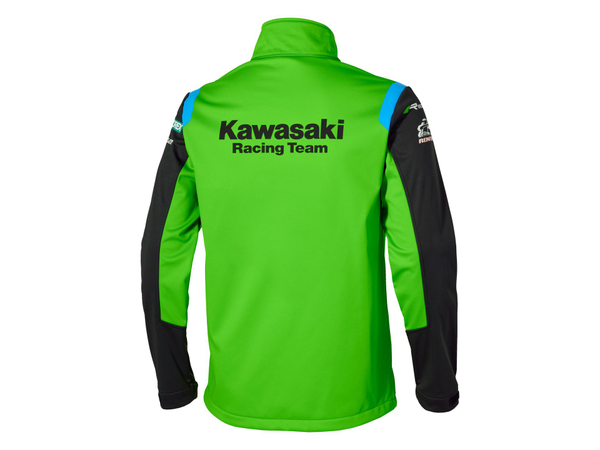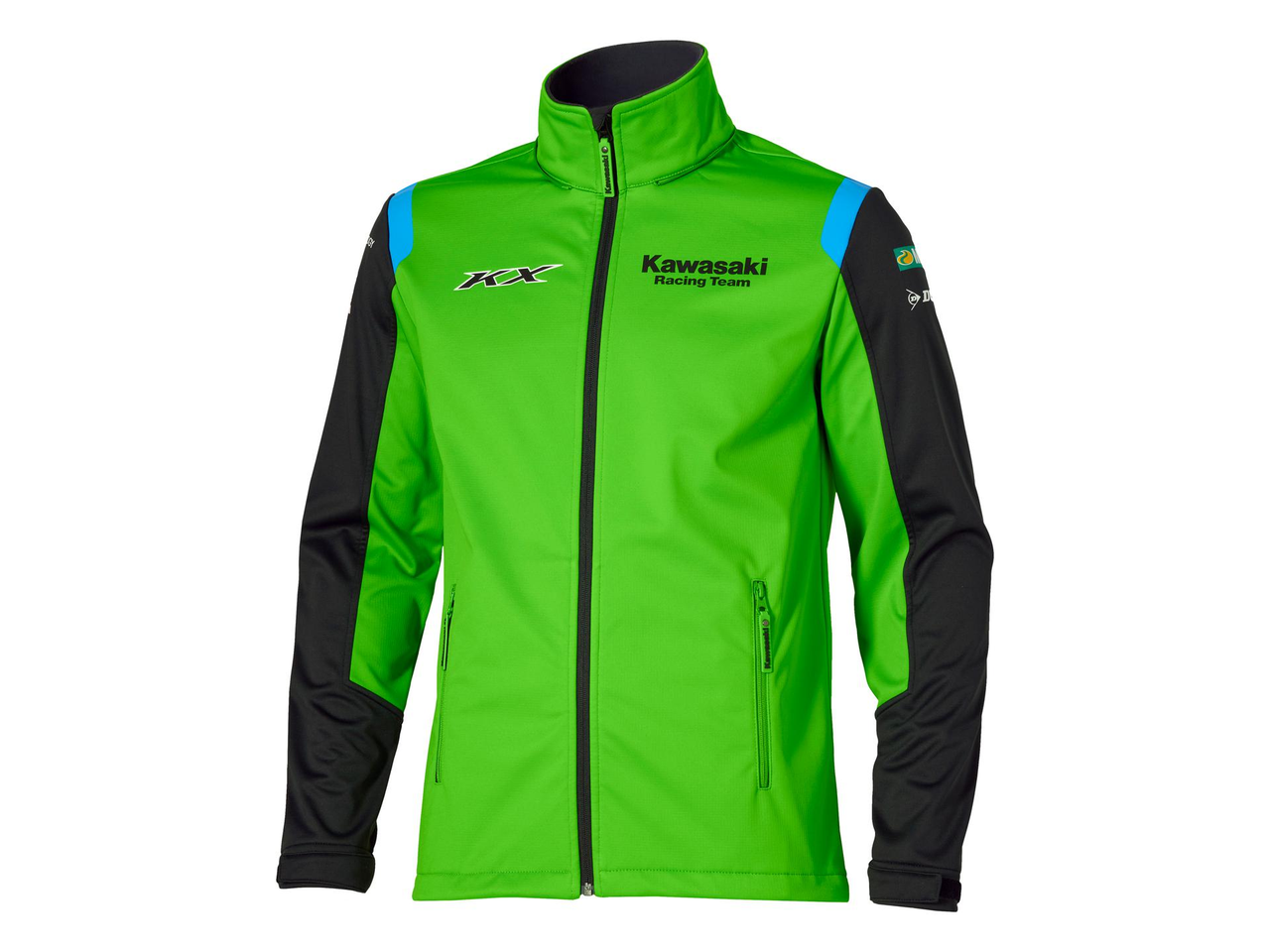 Softshell jacket in Kawasaki MXGP Team colors with detachable hood, zipped outer pockets and adjustable sleeve cuff. Extended size range with x-small to accommodate unisex fit.