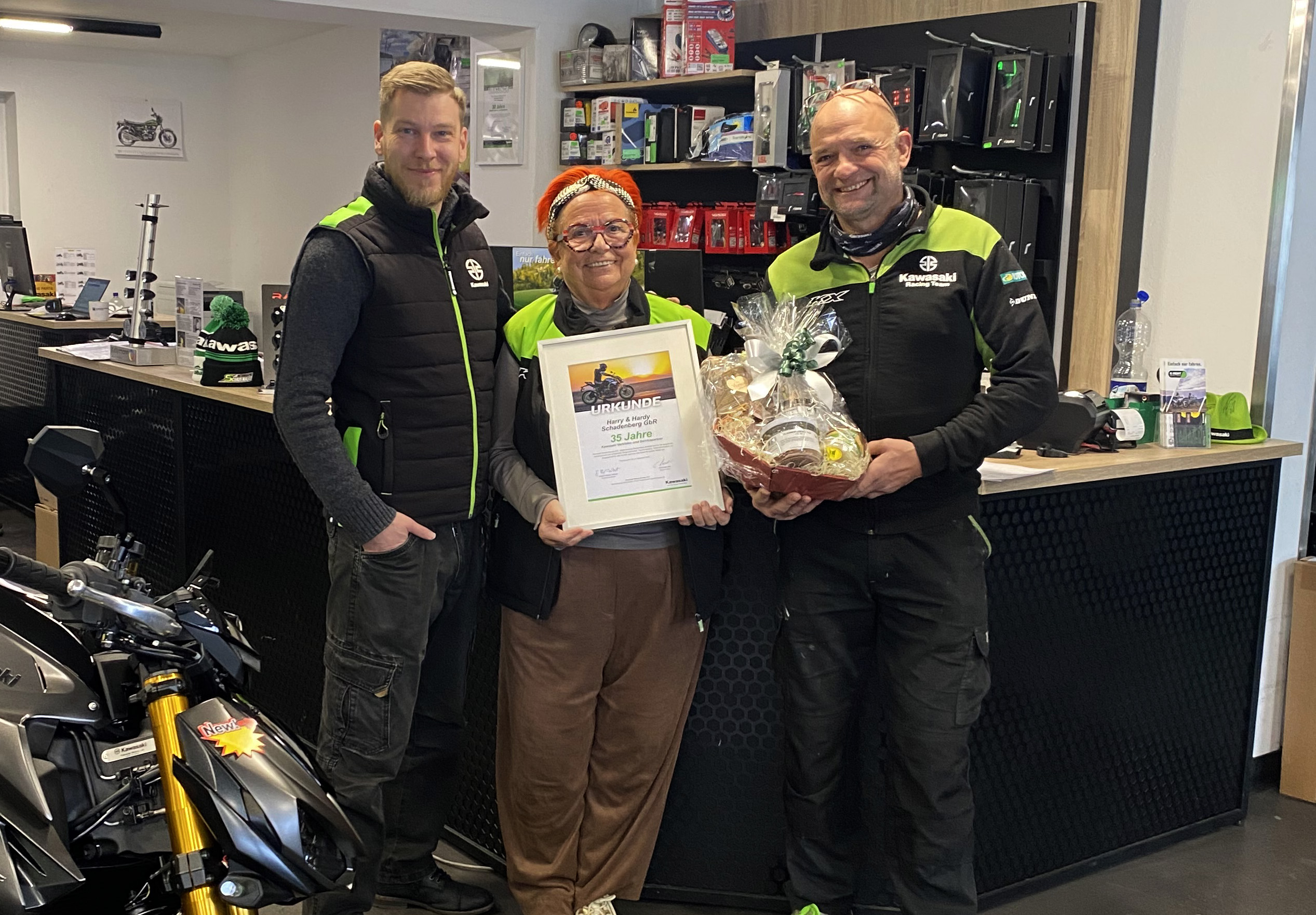 Ende der 1990er-Jahre folgte der nächste Meilenstein mit dem Kawasaki-Motocross-Vertrag. Kein Zufall: Die Söhne Harry und Hardy Schadenberg, heute Geschäftsführer, waren selbst ambitionierte Motocross-Piloten. Hardy wurde sogar DDR-Juniorenmeister, beide waren später auch erfolgreich auf Straßenmaschinen unterwegs.