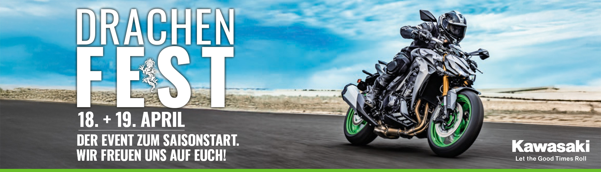 Das Drachenfest markiert traditionell den offiziellen Saisonstart bei den Kawasaki Vertragshändlern. An diesem Wochenende stehen Probefahrten, persönliche Beratung und Aktionen rund um die neue Saison im Mittelpunkt.